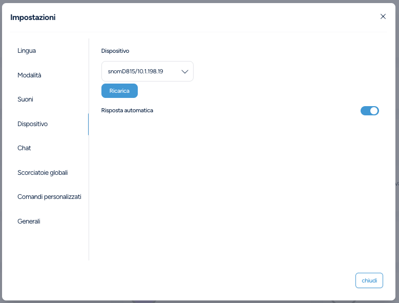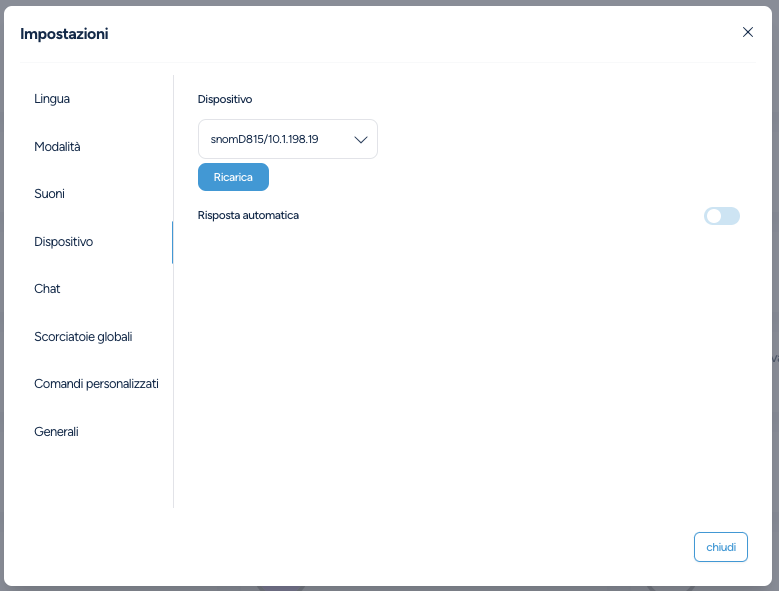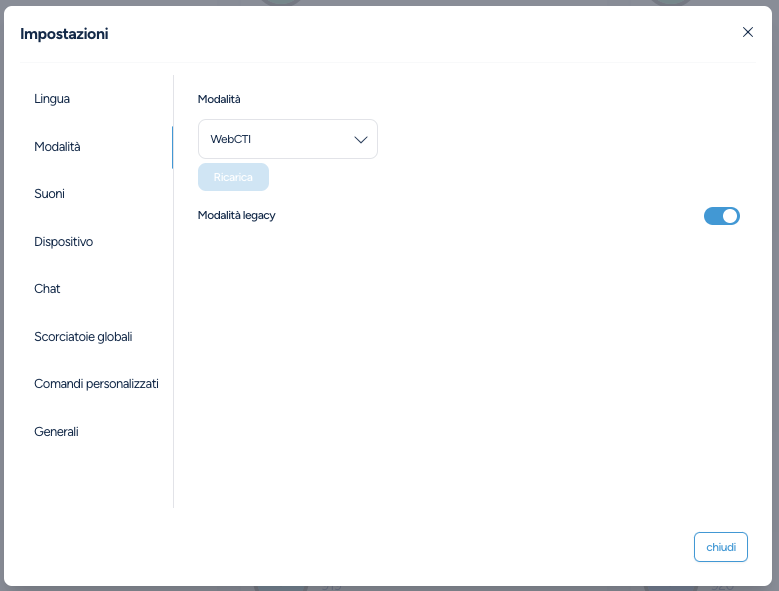 Tramite le Impostazioni, nella sezione Modalità, sarà possibile cambiare il dispositivo associato da utilizzare in modalità WebCTI