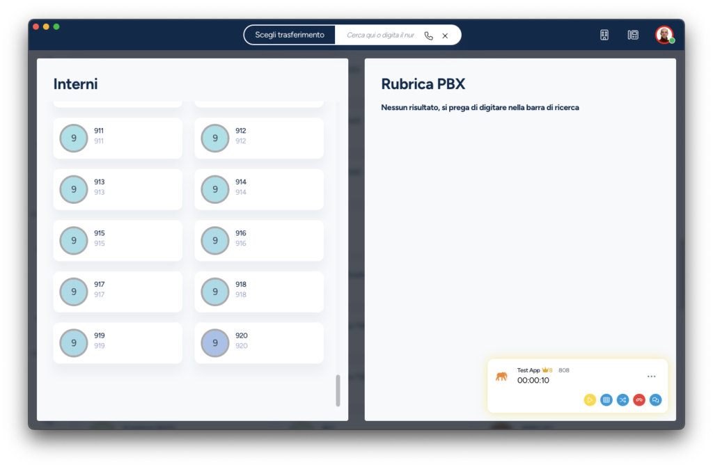 Oppure effettuando la ricerca sarà possibile portando il mouse sul contatto a cui si vuole trasferire la chiamata, premere il pulsante “Trasferisci”